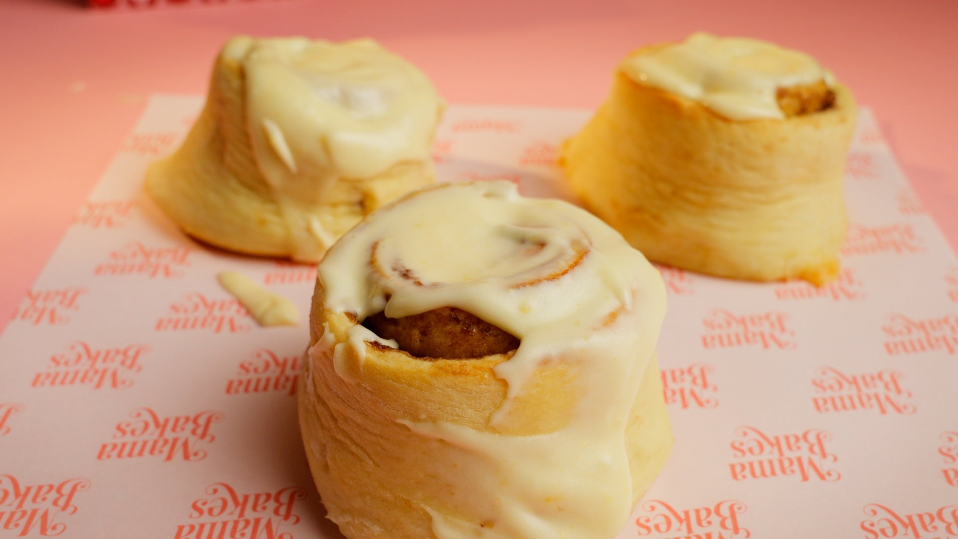 A soft, golden cinnamon swirl baked the way Mama always made it warm, fluffy, and topped with a smooth layer of cream cheese icing.